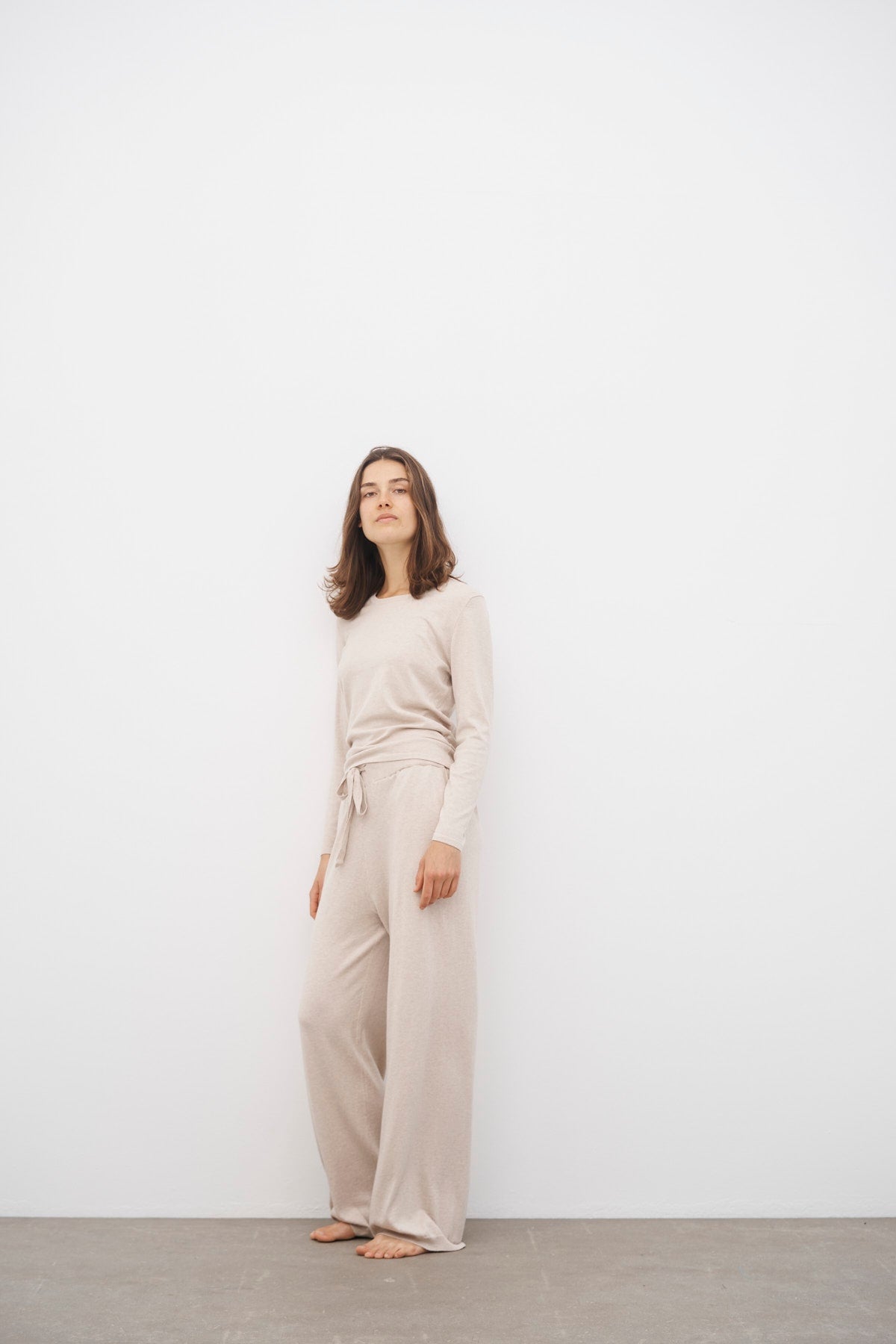 Die Bluse kann solo getragen werden, lässt sich aber auch wunderbar mit der passenden Hose oder dem weichen Wrap aus derselben Serie kombinieren.