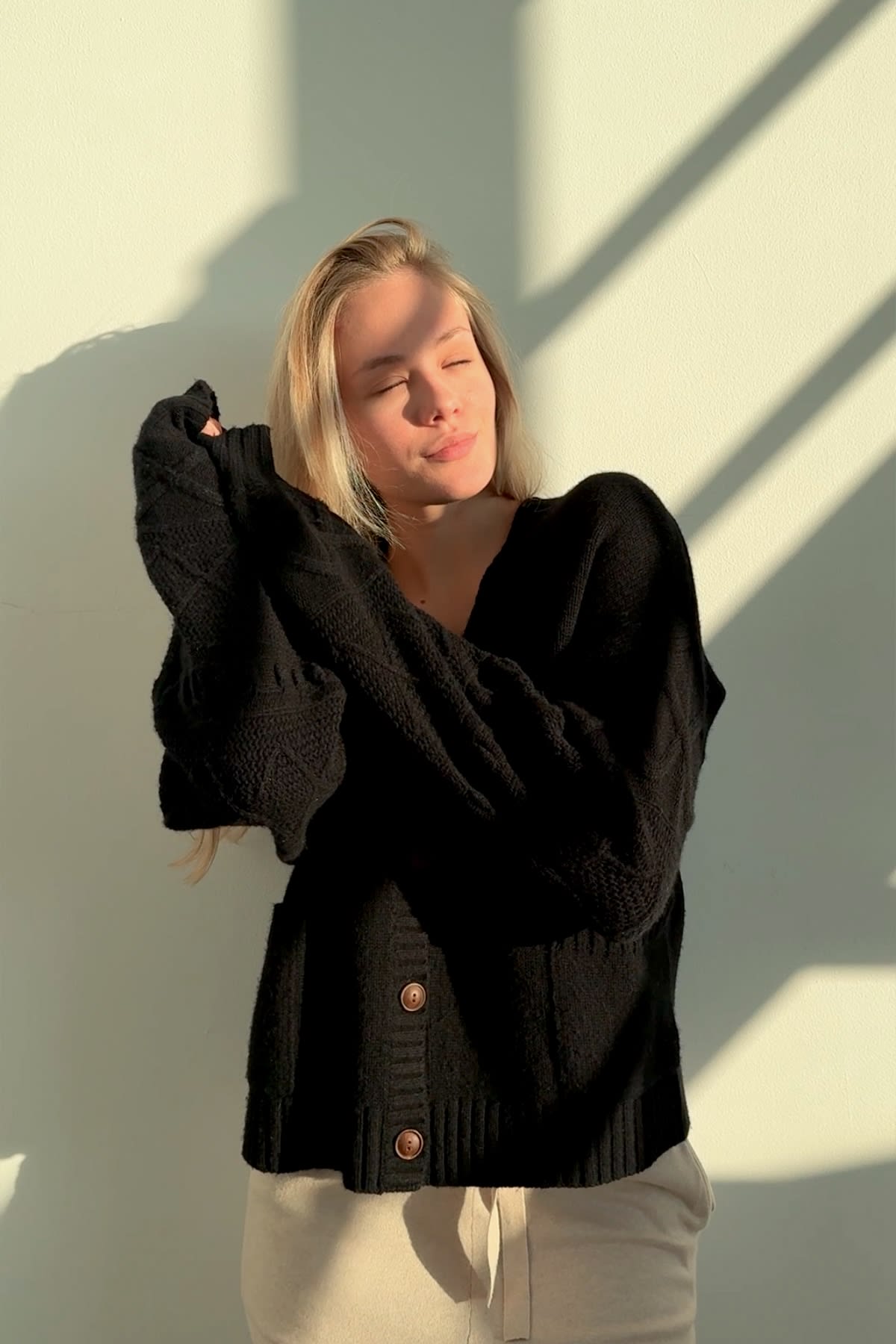 HELENA ist eine grob gestrickte und gleichzeitig sehr weiche Strickjacke mit einem wunderschönen Strickmuster an den Ärmeln – ein feminines Detail mit viel Charakter.
