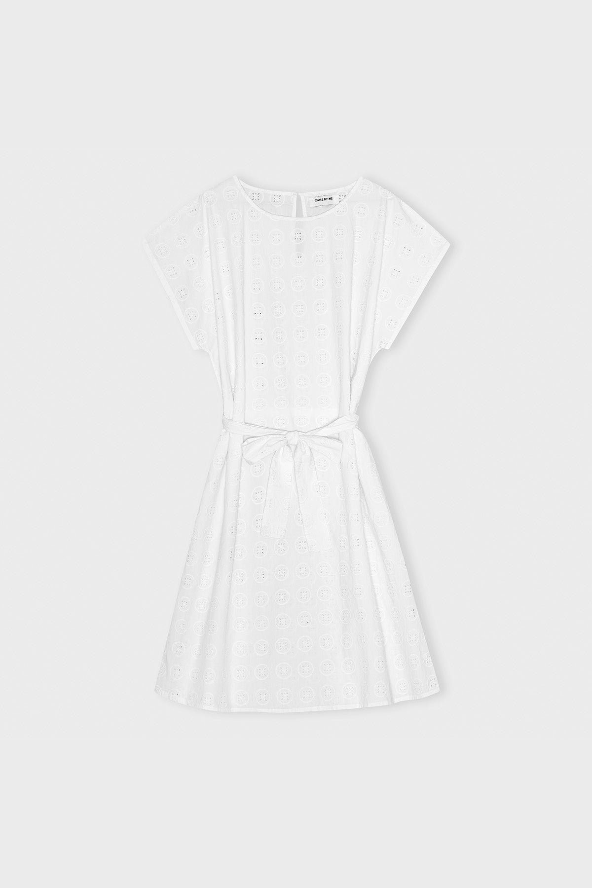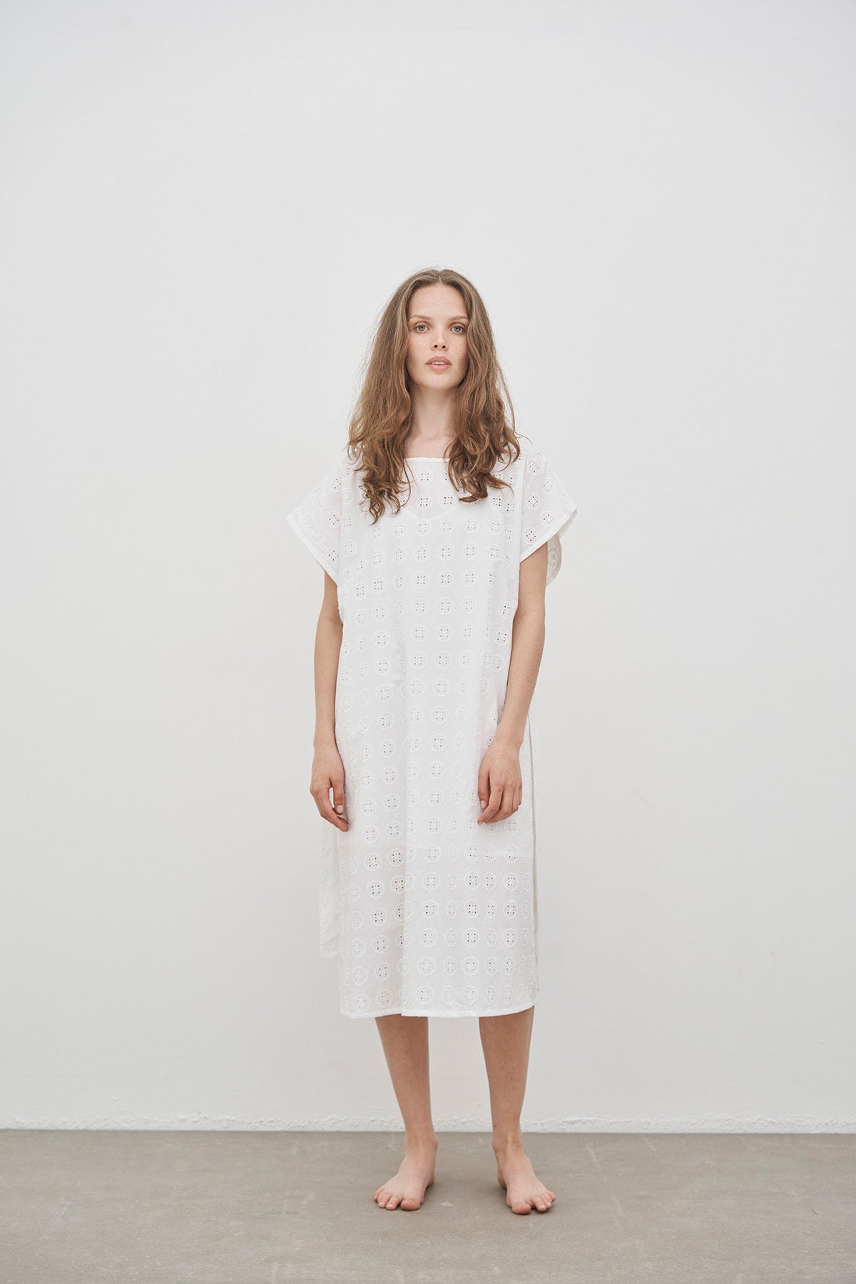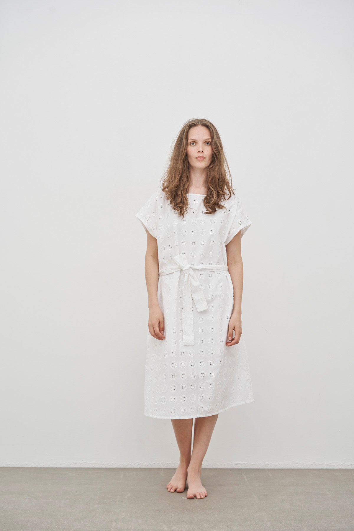 Die Tunika ist aus Bio-Baumwollpopeline gefertigt und zeichnet sich durch eine feine, minimalistische Broderie Anglaise aus.