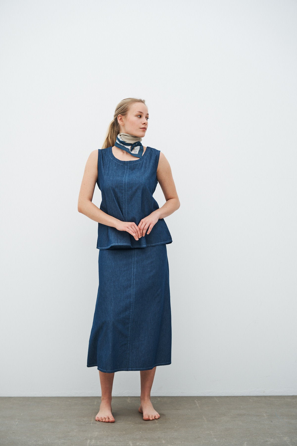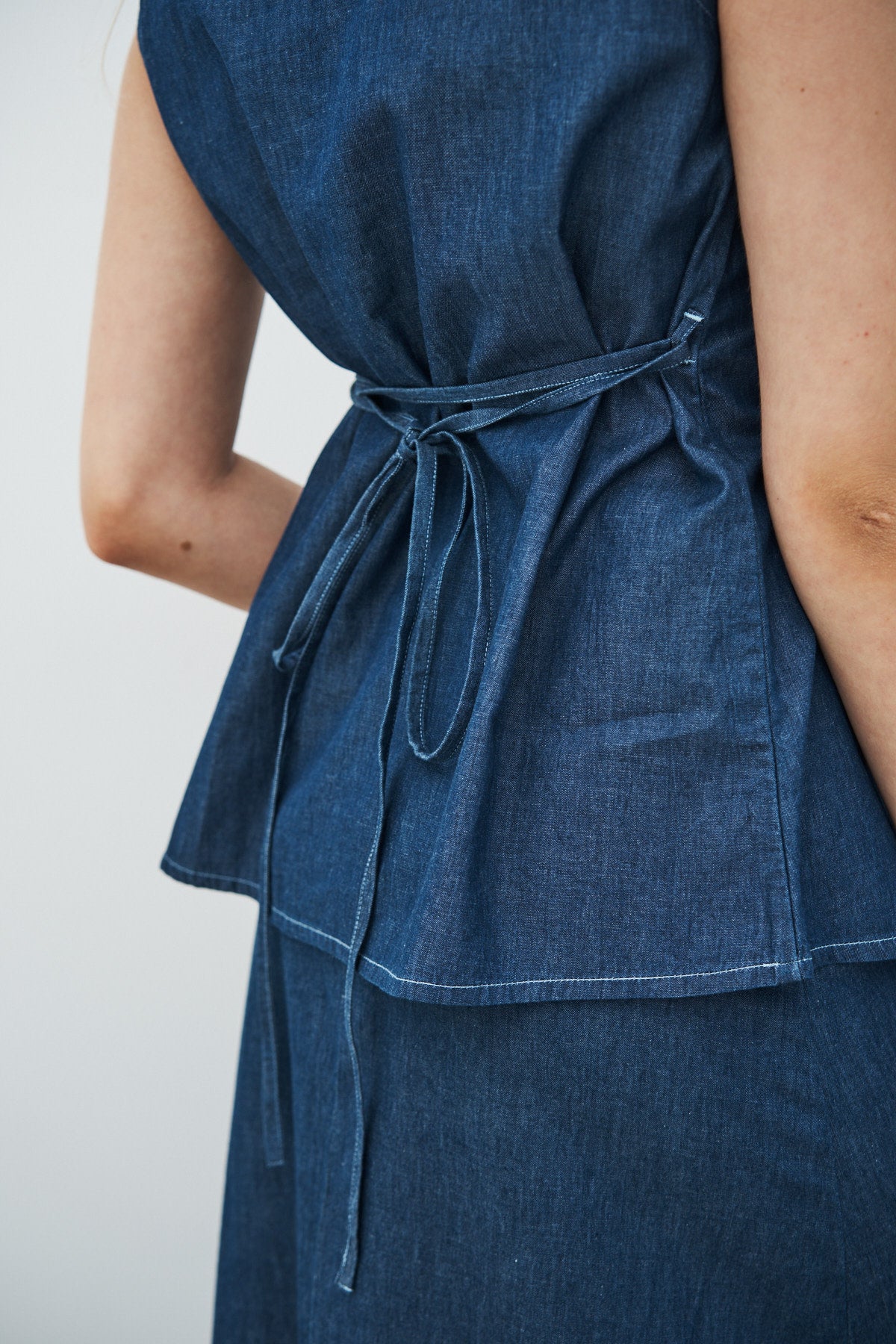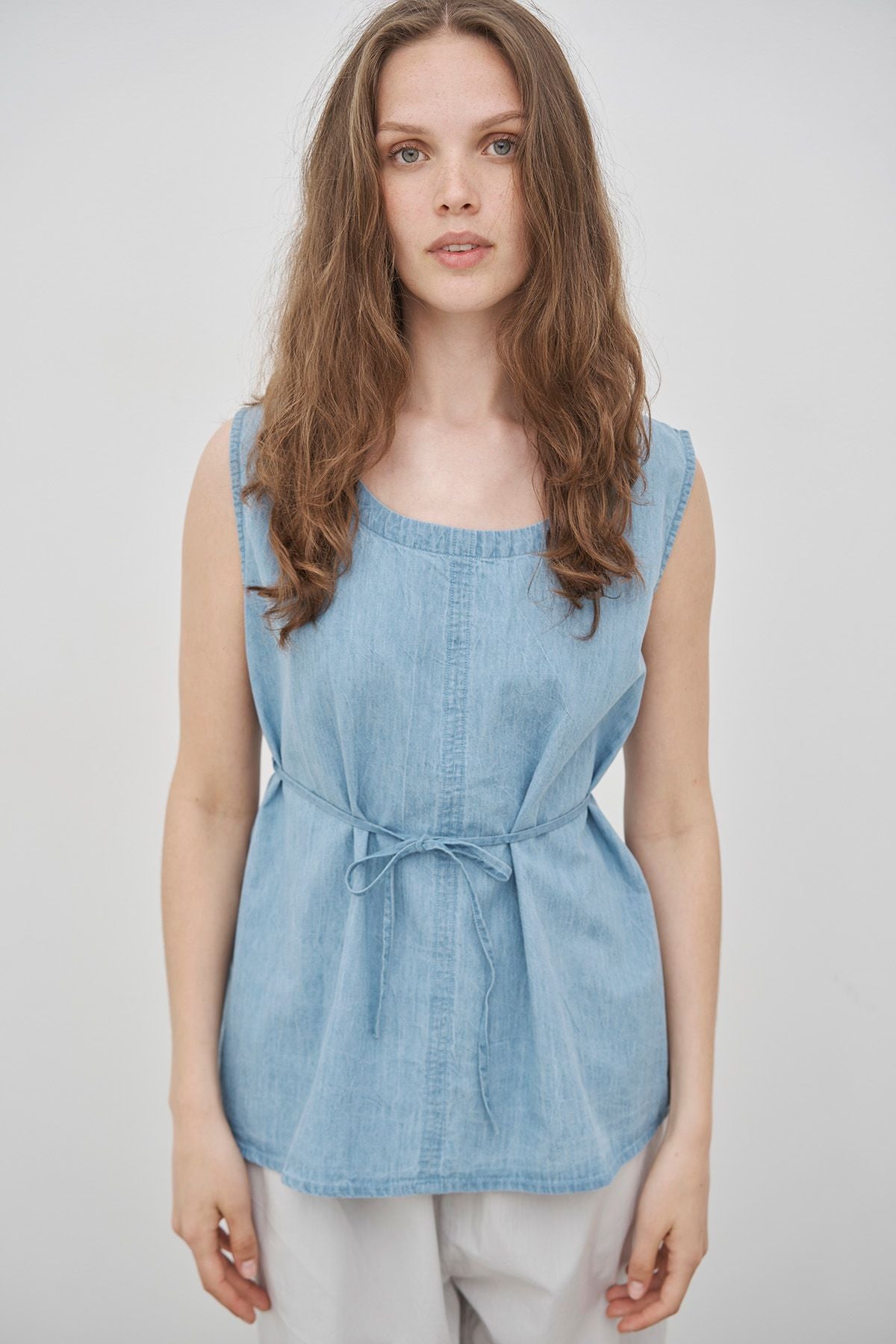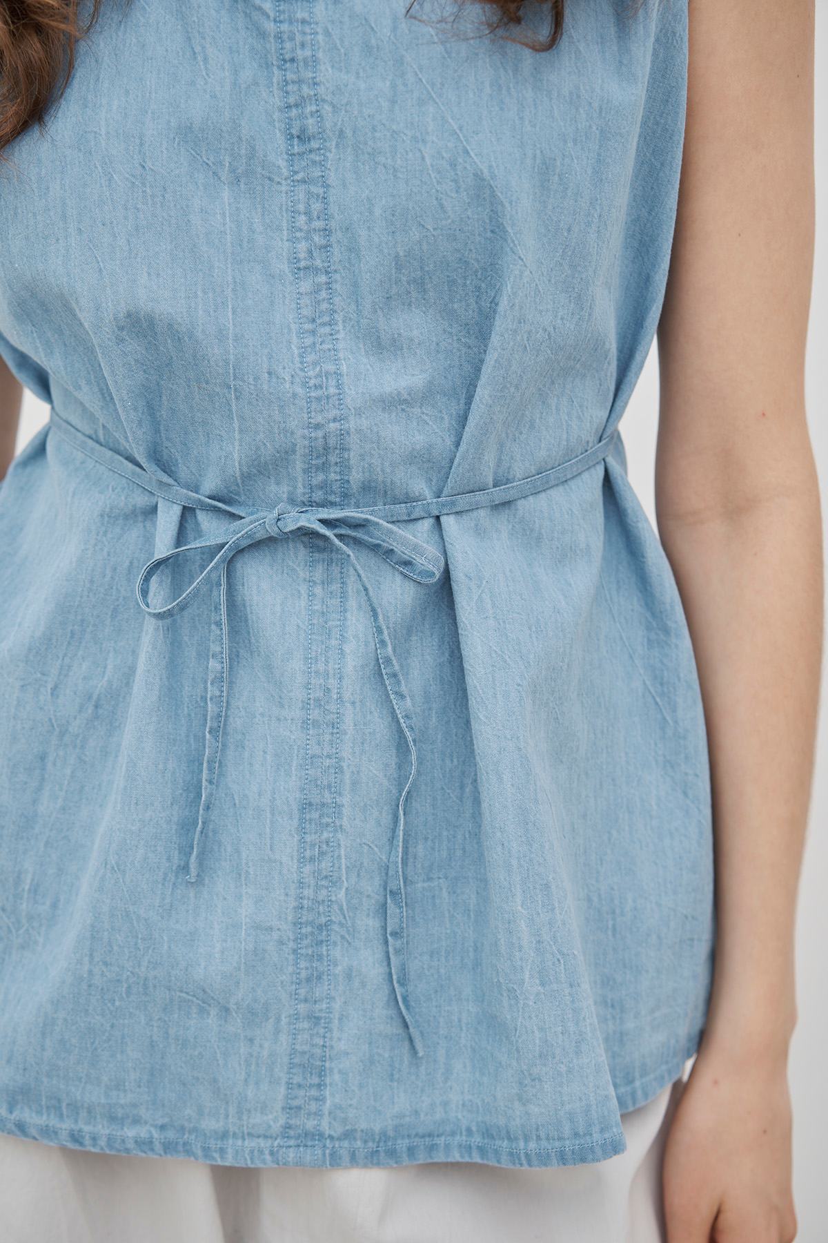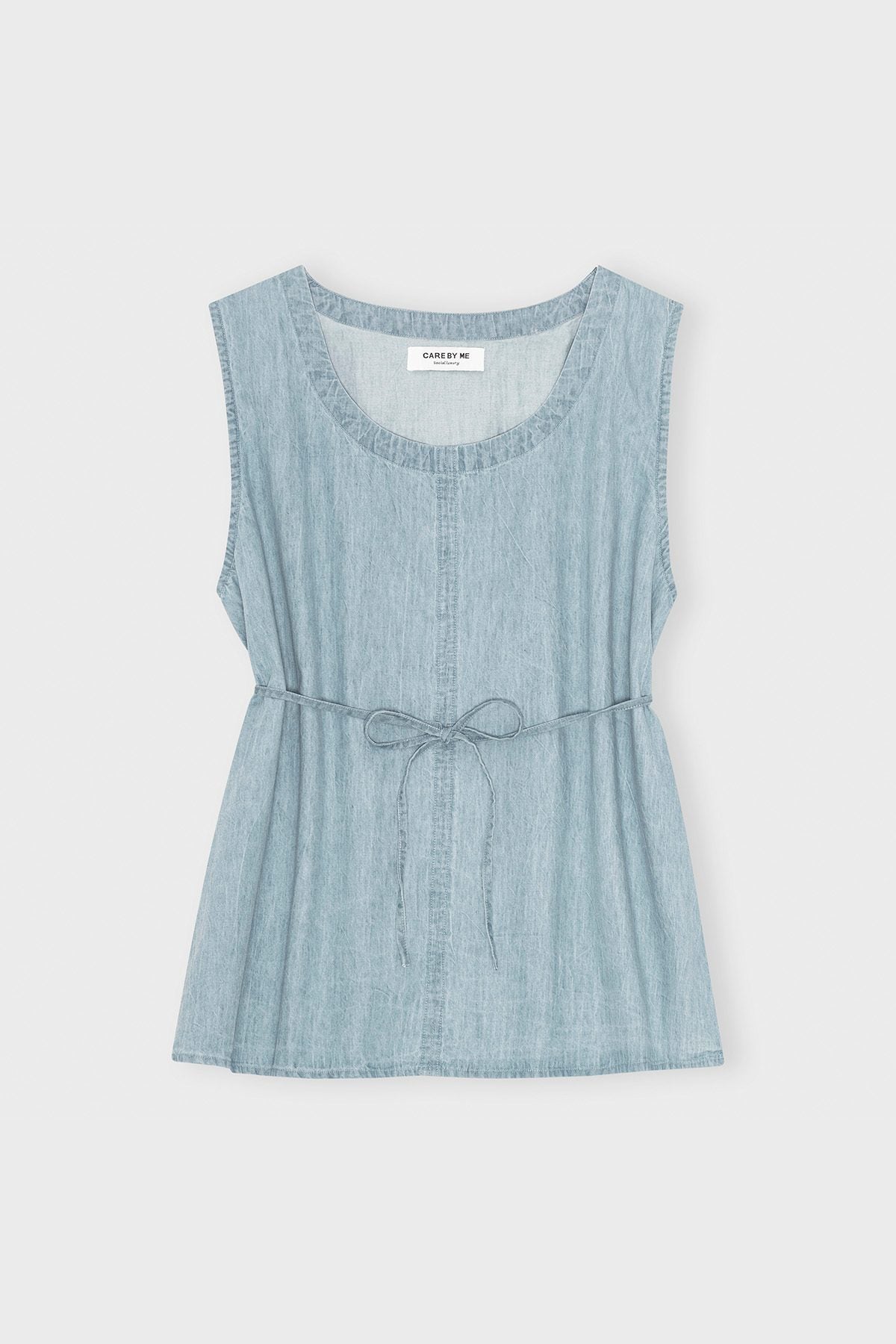 Schlichtes Top aus der Joy-Serie mit schmalem Bindeband in der Taille. Das Top ist aus Bio-Baumwoll-Denim gefertigt und überzeugt durch einen minimalistischen und eleganten Ausdruck mit sichtbaren Ziernähten auf der Vorderseite, die dem Design einen modernen Twist verleihen.