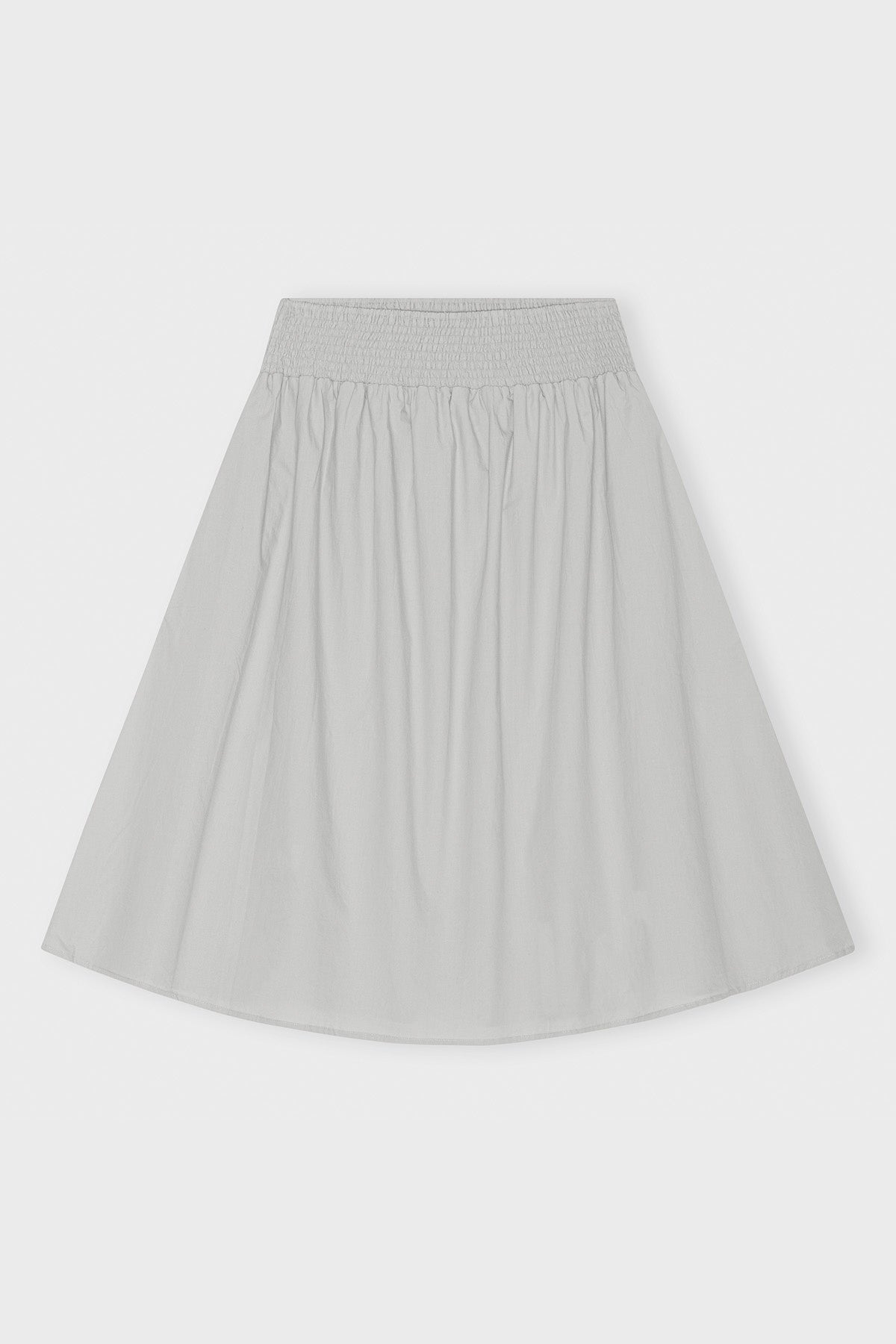 Der Rock geht bis knapp unter die Knie, hat Seitentaschen und einen breiten Smockbund, der durch sein Volumen schöne Falten wirft.