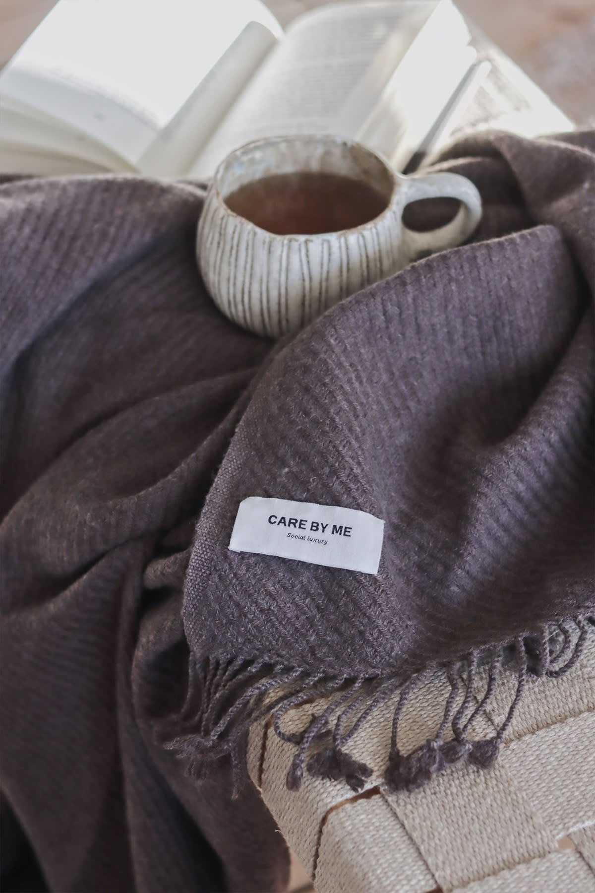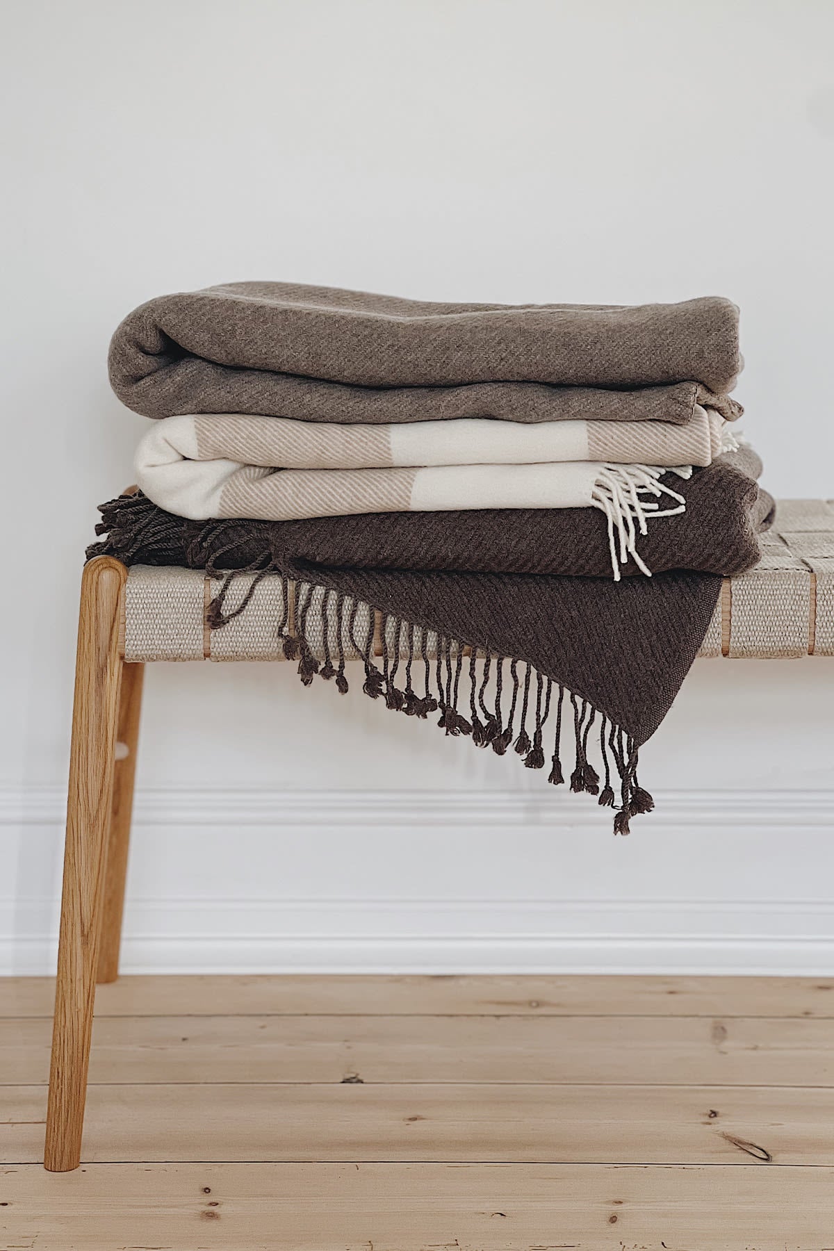 SOLENE und ihre beiden Schwestern CHARLOT und SUSAN sind elegante Wolldecken aus außergewöhnlich weicher Qualitätswolle – gewonnen von Schafen in Nepal.